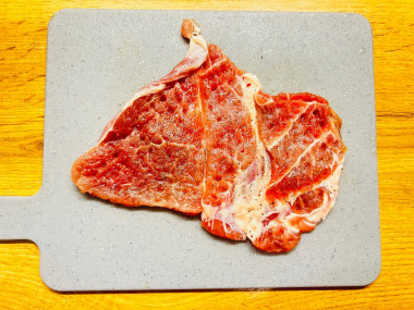Каждый отбитый кусок мяса посолите и поперчите с двух сторон.