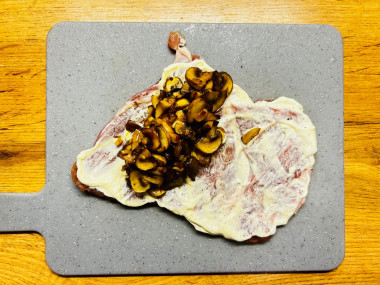 Выложите по ложке обжаренных грибов с луком на край отбивной и сверните их аккуратно рулетом.