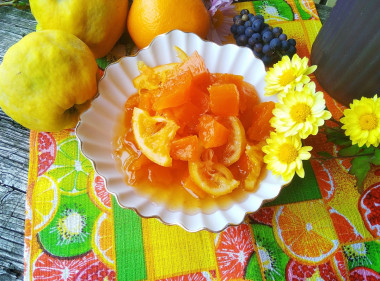 Каждый год заготавливаю варенье из тыквы. Обычно варю с лимоном или апельсином по отдельности. Но в этот раз добавила по рецепту все вместе. Мельчить я не стала, захотелось именно крупных кусочков, чтобы чувствовались. Поэтому тыкву нарезала довольно крупно, а цитрусовые на кружочки, а затем на четвертинки. Настаивались тыква с фруктами и сахаром всю ночь в холодильнике. Сока было достаточно много. Я варила в два приема. Сначала с утра довела до кипения и оставила напитываться сиропом, а вечером уже доварила и закрыла в баночки. Варенье очень вкусное! Немного чувствуется вкус и запах тыквы. Лимон и апельсин придали приятный вкусный аромат. На вкус цитрусовые тоже повлияли, сироп насыщенный, густой и прозрачный. Кусочки тыквы остались целыми, но не слишком твердыми, приятно жуются. Вообще консистенция зависит от сорта и степени спелости самой тыквы. Варенье такое солнечное, как теплая золотая осень) Отличный рецепт!