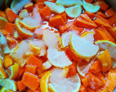 Подготовьте продукты. Тыква подойдет любая, но сорта с яркой оранжевой мякотью будут смотреться красивее. Тыкву взвешивайте уже после очистки и нарезки. Лимон и апельсин берите среднего размера. Тыкву предварительно хорошо помойте.