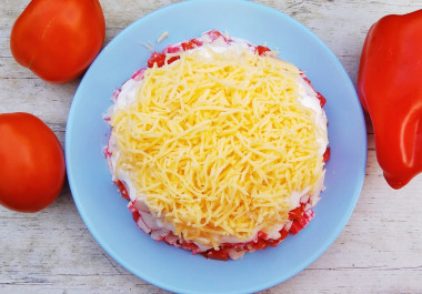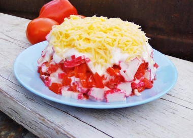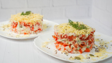 Салат Красное море с крабовыми палочками помидорами и перцем