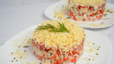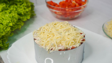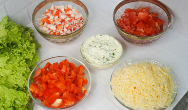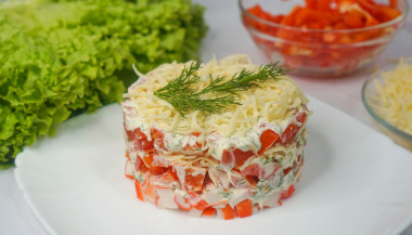 Салат собирала в кольце малого диаметра, первым слоем - крабовые палочки, затем - помидоры, перец и в завершение - тертый сыр. Слои промазывала соусом из майонеза, тертого чеснока и мелкорубленного укропа.