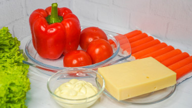 Калорийность продуктов: Помидоры, Болгарский перец, Крабовые палочки, Чеснок, Твёрдый сыр, Майонез