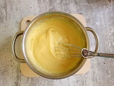 - Дайте загустеть основе крема при варке (мука или крахмал, которые берутся в зависимости от рецептуры в качестве загустителей, должны завариться, но следите, чтобы будущий крем не пригорел и не было комков).