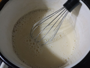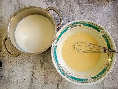 В теплое молоко при постоянном помешивании влейте постепенно яично-молочную смесь.