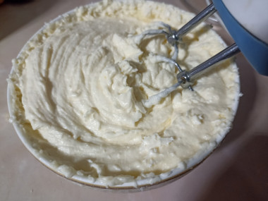 Мягкое сливочное масло взбейте миксером с ванильным сахаром (или ванилином) до пышности в течение примерно 2-3 минут (в зависимости от мощности миксера).