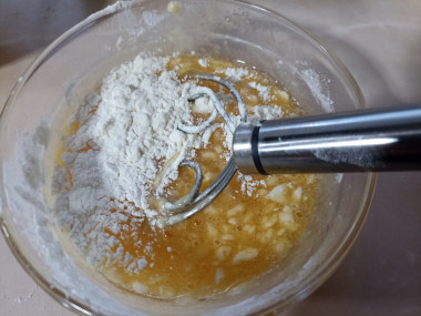 Всыпьте муку. Перемешайте массу до исчезновения комочков.