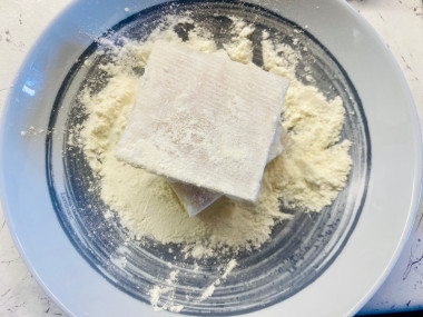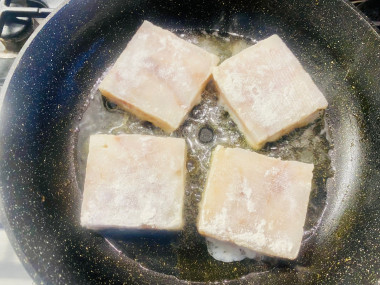Порционные куски филе трески обваляйте с двух сторон в муке. На сковороде на среднем огне разогрейте растительное масло для жарки. Выложите на нее запанированную рыбу. Обжарьте ее с обеих сторон до румяной корочки, около 10 минут.