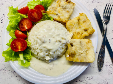 В каждую тарелку положите отварной рис, выложите обжаренные кусочки рыбы и полейте их соусом. Подавайте к столу. Приятного аппетита!