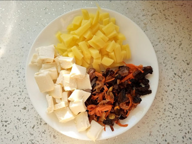 Через 15 минут после закипания картофеля добавьте в кастрюлю грибную зажарку и сырок.