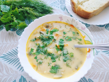 Можно приготовить такой суп с курицей, грибами и плавленым сыром.