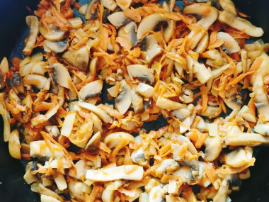 Налейте на сковороду растительное масло и немного его прогрейте. О том, как правильно выбрать масло, читайте в отдельной статье, ссылка в конце рецепта. Отправьте на сковороду морковь, лук и грибы. Добавьте немного соли. Жарьте овощи с грибами на огне больше среднего в течение около 7 минут, периодически помешивая. Если жарить грибы на сильном огне, то сок останется внутри них и не вытечет на сковороду.