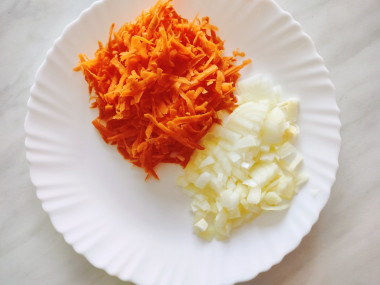 Морковь очистите, обмойте и нарежьте мелким кубиком. При желании можно натереть морковь на крупной терке. Мне морковь кубиком больше нравится для этого супа. Лук очистите, обмойте холодной водой, чтобы он не щипал глаза, и мелко нарежьте.