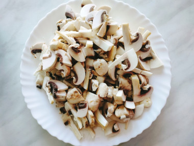 Покупайте свежие шампиньоны среднего размера, снежно-белого цвета без пятен, повреждений, запаха гнили. На ощупь они не должны быть скользкими. Тщательно промойте грибы от грунта под струей теплой или холодной воды. Вырежьте подпорченные места, если они есть. Миниатюрные грибочки размером до 2 см чистить совершенно не обязательно, достаточно их хорошо промыть. Более крупные шампиньоны рекомендуется чистить от пленочек.
