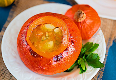 Подавайте кашу прямо в тыкве, разрезав овощ острым ножом на порционные части. Приятного аппетита!