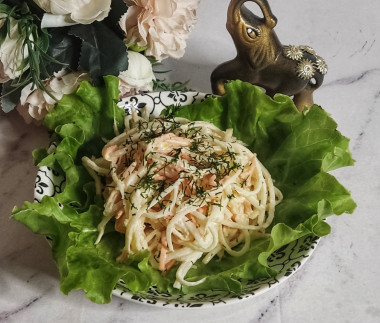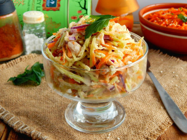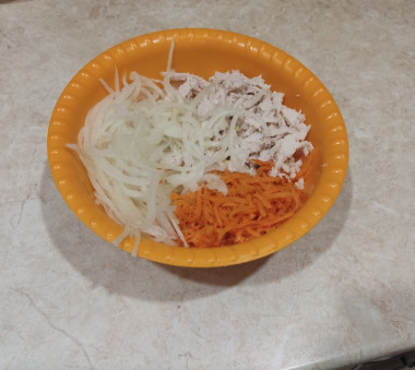 Приготовила салат лисичка с корейской морковкой. Вкус нового для меня салата очень понравился. Редька у меня была белая,которую я натерла на тёрке для корейской моркови. Лук был обычный, репчатый,я порезала его тонкими полукольцами. Куриное филе отварила и порезала соломкой.Смешала все ингредиенты для салата и заправила майонезом.