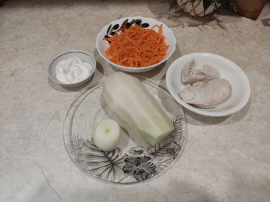 Как сделать салат Лисичка с корейской морковкой? Приготовьте ингредиенты для салата. Количество продуктов и состав по желанию можно изменить. Салат готовится очень просто и быстро, если все ингредиенты для его приготовления приготовлены заранее. Например, куриное филе лучше отварить заранее.