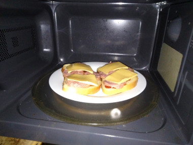Сыр нарежьте острым широким ножом на тонкие слайсы и положите на бутерброды. Положите бутерброд на тарелку и поставьте ее в микроволновую печь. Точное время и мощность зависят от особенностей работы вашей микроволновки. Слой сыра должен быть мягким и расплавиться, а начинка бутерброда прогреться и пропитаться соусом. Я готовила при 1000 Вт 1 минуту 30 секунд. Подробнее об микроволновках читайте в конце рецепта.