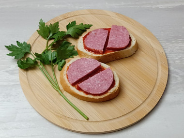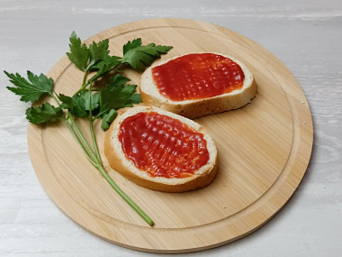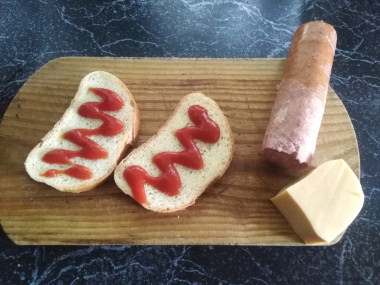 Смажьте ломтик хлеба тонким слоем кетчупа или плотного томатного соуса. Кетчуп при этом лучше брать густой консистенции. Так как слишком жидкий соус пропитает тонкий кусочек хлеба, и бутерброд получится слишком мокрым.