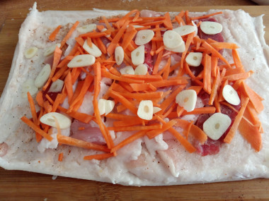 4. Положить пласт сала на доску и сверху на внутреннюю его сторону равномерно распределить кусочки телятины, измельченную морковь и чеснок. Далее обильно посыпать сушеным укропом.