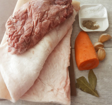 1. Со шкурки сала соскоблить грязь с помощью хорошо заточенного ножа. Затем тщательно промыть кусок свинины под струей холодной воды. Положить его на доску и отрезать слишком толстые или выступающие части. Обильно натереть внутреннюю часть куска солью и смесью молотых перцев, тщательно втирая специи в сало.