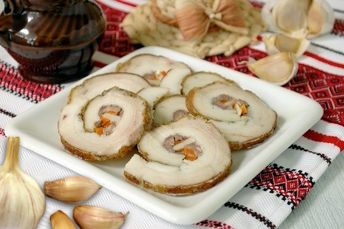 Готовый вареный рулет из сала подавать на стол охлажденным, нарезая тонкими кружочками.