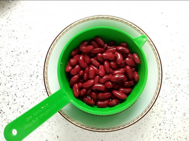 Подготовьте все необходимые ингредиенты. По классическому рецепту в приготовлении салата используется свежая красная фасоль. Но если нет времени на подготовку сухой фасоли, которого требуется не мало, то можно добавить консервированную. Сухую фасоль нужно промыть, залить холодной водой, оставить фасоль на ночь, чтобы она хорошо разбухла.