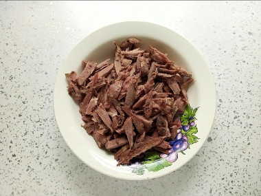 Говядину промойте, срежьте жилки и кожицу. Нарежьте мясо на куски и отварите в подсоленной воде до готовности в течение 40-60 минут. Точное время будет зависеть от размера кусочков, части туши и возраста животного (мясо молодого животного сварится заметно быстрее.) Готовую говядину оставьте остывать в бульоне. Затем мясо выньте из бульона, нарежьте на маленькие кубики или разделите на тонкие волокна.