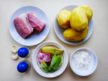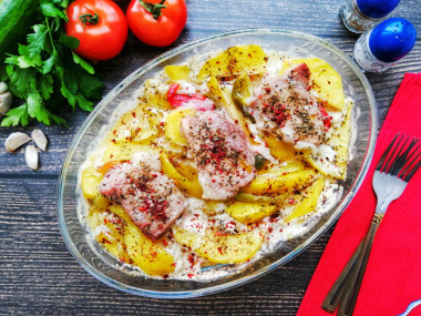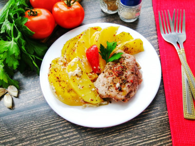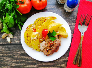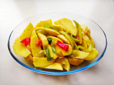 На второе сделала свинину с картошкой в сметане. Картошку нарезала дольками, соединила с болгарским перцем (у меня был замороженный), солью и специями - итальянскими травами. Готовила без сыра, его я не добавляла.