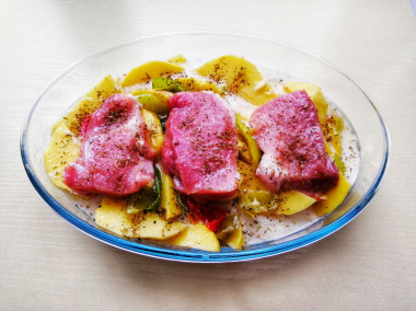 7. Свиное филе промоем и обсушим бумажными полотенцами. Затем порежем мясо на порционные отбивные и положим в форму для запекания прямо сверху ранее уложенной картошки. Посолим и приправим черным молотым перцем по вкусу.