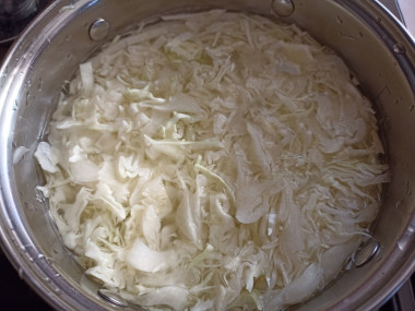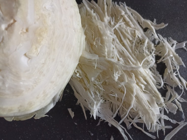 Нашинкуйте белокочанную капусту. Будет вкуснее, если вы возьмете спелый, сочный, белоснежный кочан. Можете нарезать его ножом или специальной теркой-шинковкой. Опустите капусту на 2-3 минуты в рассол.