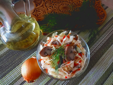 Грибы заранее отварите (лесные я тоже предварительно засаливаю дня на 2-3, шампиньоны можно просто отварить и порезать тонкими пластинками). Уложите на капусту слой грибов.