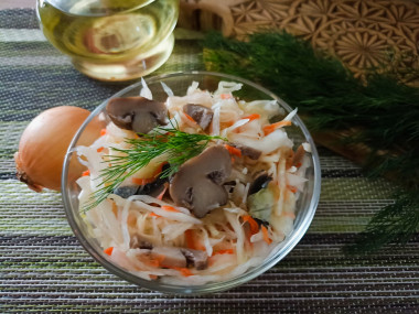 Набитую плотно в банку или ведро квашеную капусту с грибами можете залить подсолнечным маслом — получится готовый салат. Употреблять капусту можно сразу. Хранить лучше в прохладном месте. Приятного аппетита!