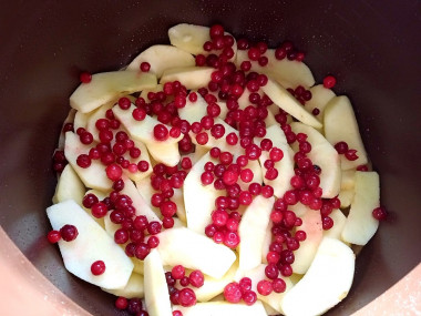 В застеленную пергаментом и смазанную растительным маслом форму для выпечки выложить яблоки и бруснику.