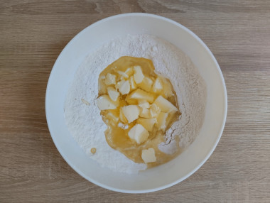 Затем добавьте растительное и сливочное масло, перемешайте. Сливочное масло лучше заранее достать их холодильника, чтобы оно стало мягче. Если вы этого не сделали, просто нарежьте его небольшими кусочками и потом добавьте в тесто. Добавьте крахмал и тщательно все перемешайте. Крахмал сделает печенье более хрустящим.
