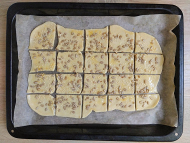 Распределите кунжут и семечки по раскатанному тесту. Вдавите их немного в тесто, прокатав скалкой. Разрежьте фигурным или обычным ножом на квадратики. Размер делайте по своему усмотрению. У меня примерно 8х8 см. Для выпекания подойдет стандартный большой противень от вашей духовки. Перенесите на него пергамент с тестом. Поставьте в разогретую до 180 градусов духовку и выпекайте до легкого румянца примерно 15 минут. О работе духовок читайте под шагами.