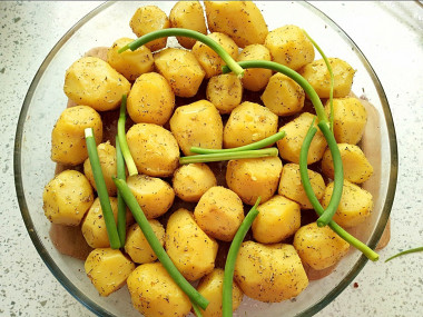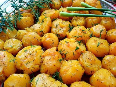 Любимый сайт выручит всегда! Попросила мужа купить картошки, а он принес какой-то "горох") И ладно бы молодая была, я бы ее в кожуре запекла, но картошка оказалась не очень молодой. Стала искать рецепт куда бы ее пристроить. И нашла подходящий! Только вот чистить мне не захотелось, поэтому картошку помыла и отварила до полуготовности. Потом почистила, так шкурка легче снимается. Свежего розмарина у меня не было, как и чеснока. Поэтому сделала немного по другому. Прямо в форме полила картошку маслом, посыпала чесночным порошком, копченой паприкой, добавила щепотку приправы для картофеля и сушеный розмарин. Обожаю сочетание картошки и розмарина! Все это перемешала и запекла, выложив сверху несколько чесночный стрелок, чтобы они передали свой пряный аромат картошке. Спустя 30 минут помяла клубни толкушкой убрала стрелки и ещё 20 минут запекала. Печеная картошка в духовке получилась просто отличная! Красивая, золотистая, очень вкусная с пряным привкусом. Аромат чеснока и розмарина потрясающий. Мне всегда кажется, что розмарин пахнет сосной и цитрусом, поэтому такой душистый букет мне очень нравится. И он отлично дополняет запеченую картошку.