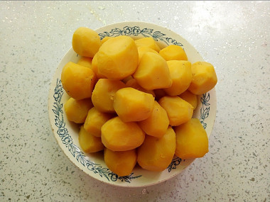 Картофель вымойте, очистите и снова промойте в проточной воде. Если картофель крупный, разрежьте его пополам, мелкие клубни оставьте целыми.