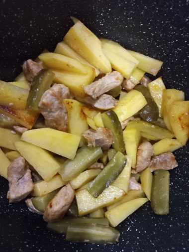 Добавьте в сковороду соленые огурцы. Перемешайте.