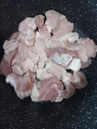 Свинину, если она была заморожена, предварительно разморозьте, переложив из морозилки на нижнюю полку холодильника. Размороженное мясо помойте и обсушите бумажными полотенцами. Нарежьте мякоть небольшими брусочками.