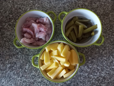 Картофель помойте, очистите и также нарежьте брусочками, примерно равными по размеру свинине.