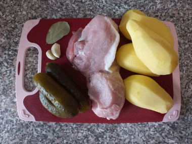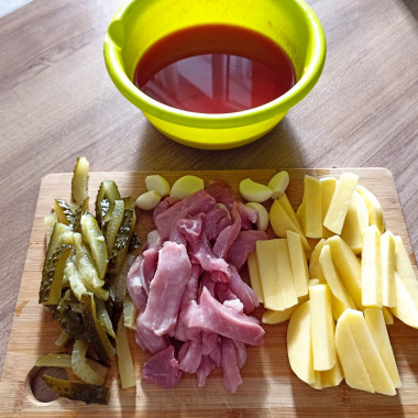 Как сделать азу из свинины с солеными огурцами и картошкой на сковороде? Подготовьте ингредиенты. Для этого рецепта не имеет значения, мясо от какой части туши выбрать, так как в процессе приготовления оно всё равно станет мягким. Огурцы, соленые бочковым способом будут в этом блюде вкуснее, но, за неимением, подойдут и маринованные. Томатную пасту можно заменить на измельченные свежие помидоры, также можете добавить морковь, лук.