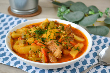 Все тщательно перемешайте. Накройте сковороду крышкой и тушите азу на медленном огне примерно 20-25 минут.