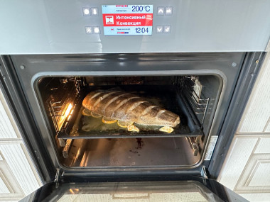 6. Форму для запекания с расположенной на ней рыбой поставить в разогретый духовой шкаф примерно на 25-30 минут для полной готовности и образования сверху аппетитной золотистой корочки.