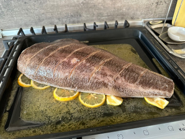 Положить рыбу на разделочную доску и с помощью острого ножа сделать неглубокие поперечные надрезы по всей поверхности рыбы, не затрагивая при этом позвоночную кость. Перевернуть палтуса на другую сторону и сделать такие же поперечные надрезы и на той стороне. Это нужно для того, чтобы рыба в процессе запекания равномерно прожарилась и оставалась сочной внутри.