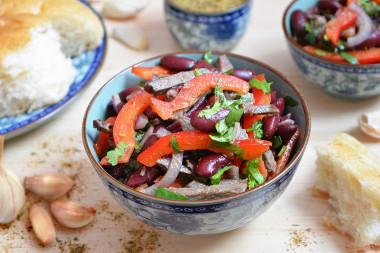 Как сделать салат с консервированной фасолью и мясом? Рецепт очень простой. Для начала подготовьте необходимые ингредиенты по списку. Какое мясо можно взять вместо говядины? Любое. Свинину, курицу или индейку. Овощную смесь можете дополнять или заменять по своему вкусу. Ссылку на рецепт гранатового соуса вы найдете в конце рецепта.