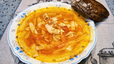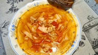 5. В большую кастрюлю переложить отваренную домашнюю лапшу, обжаренные овощи и куриное филе. Влить в кастрюлю куриный бульон и поставить на плиту на медленный огонь. Если вы готовите лагман на несколько приёмов пищи, то в таком случае лапшу лучше добавлять в бульон при подаче. При длительном хранении лапша в бульоне сильно разбухнет и превратится в кашу.