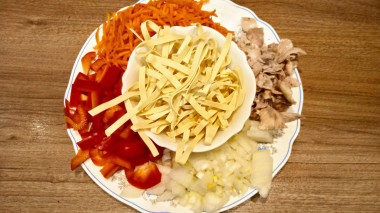 4. Параллельно с обжариванием курицы и овощей отварить домашнюю тонкую лапшу (можно заменить магазинными спагетти, а иногда в продаже попадается специальная лапша для лагмана) до полуготовности и слить лишнюю воду, откинув лапшу на дуршлаг.