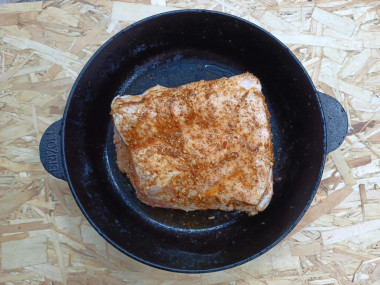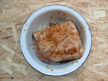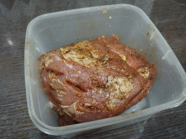 Смешала специи с маслом растительным и натерла мясо со всех сторон. Накрыла плёнкой и убрала в холодильник на ночь мариноваться.