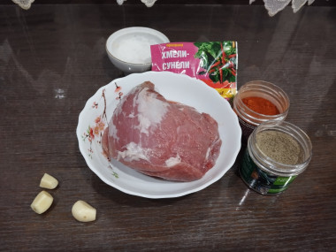 Калорийность продуктов: Окорок свиной, Паприка, Оливковое масло, Чеснок, Хмели-сунели, Кайенский перец, Перец черный молотый, Соль